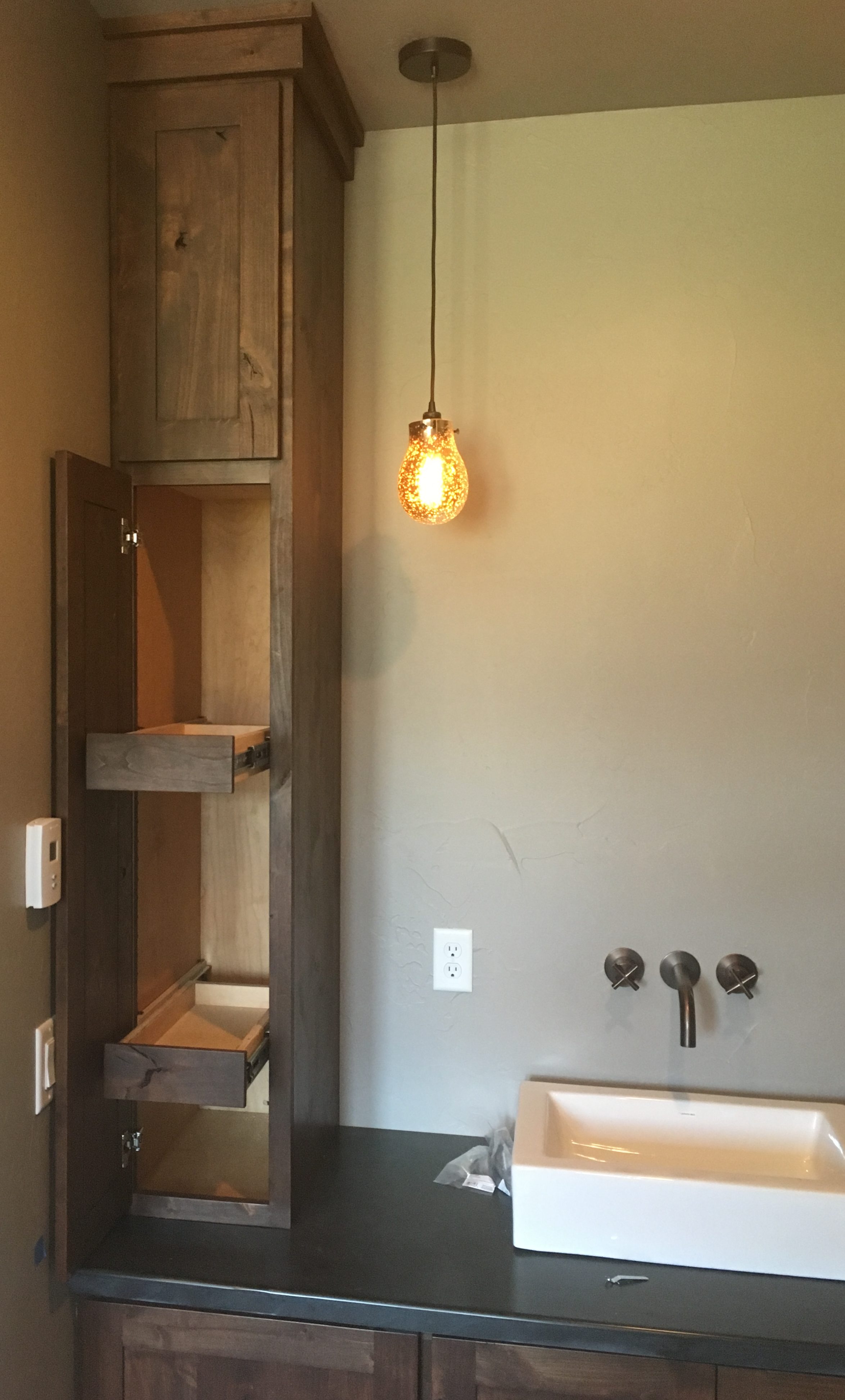 We always need more storage in the bathroom.  Why not make it easily accessible and stylish?  This built in cabinet is in a bathroom.  You can see the sink and the beautiful wall mounted faucet.  Mirror was yet to come when we snapped this picture.  Slide out shelves make it easy to grab bottles from our bathroom lotions and potions that end up in the back.  Easy peasy.  Simple solutions.  What do you want in your bathroom?  Does it need a complete overhaul of your cabinets, or just a simple upgrade?  We can make it happen.